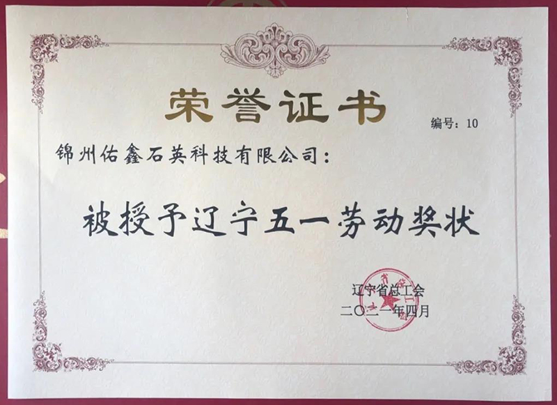 佑鑫石英被授予為"遼寧省五一勞動獎狀"獲得者,這份榮譽(yù)是對優(yōu)秀企業(yè)的最高褒獎。勞動最光榮,奮斗最美麗,榮譽(yù)來之不易,成績的背后,凝聚著佑鑫人的辛勤與汗水。
